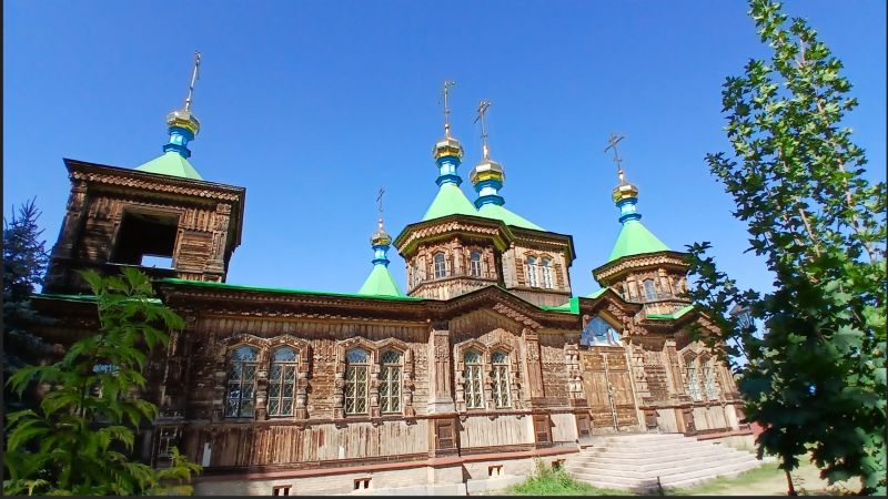 与之相对的 俄罗斯东正教堂(圣三一大教堂)同样位于卡拉科尔,建于19世纪末,由全木结构搭建,绿顶金十字在蓝天雪山背景下格外醒目。教堂曾在苏联时期被改作学校和运动场,但后来重新修复并恢复宗教功能。教堂内部拥有精美的圣像画、雕刻和木质细节,展现出典型的俄罗斯东正教艺术传统。