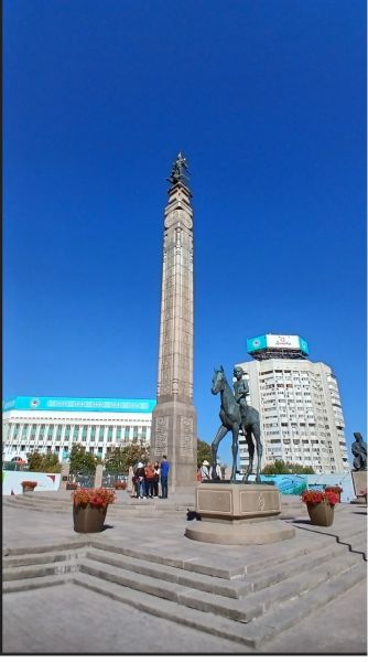 我们还参观了共和国广场(Republic Square),又称独立广场或新广场。它是阿拉木图市中心的主要广场,建于1980年,原名勃列日涅夫广场,后更名以纪念独立。广场面积广阔,长580米、宽210米,四周环绕阿拉木图市政府大楼(原总统府)、学校宫等建筑。核心景点为独立纪念碑,高28米石柱顶立“黄金人”雕像,脚下翼豹飞翔,象征哈萨克斯坦独立与力量,周围有浮雕描绘国家历史。