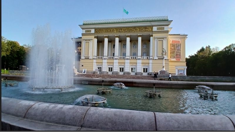 阿拜哈萨克国家歌剧和芭蕾舞剧院(Abai Kazakh National Opera and Ballet Theatre)位于阿拉木图市中心,1934年建立,1941年大楼落成,1945年以哈萨克伟大诗人阿拜·库南巴耶夫命名。剧院建筑融合古典与民族元素,可容纳近900席,上演世界经典歌剧、芭蕾及哈萨克本土作品,是中亚文化瑰宝。我们跑去了,可惜不开门,只能外观。