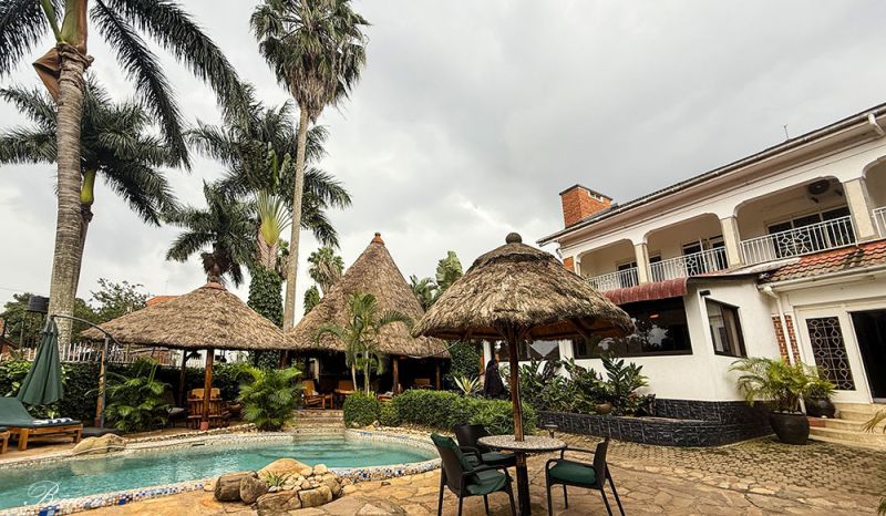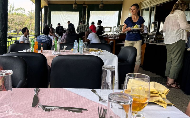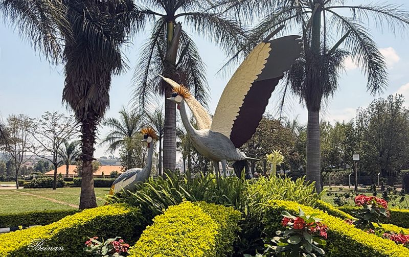 中午停留吃午饭的地方给了我们一个惊喜。这里环境优美,像一个大花园。门口有一对乌干达国鸟的塑像。