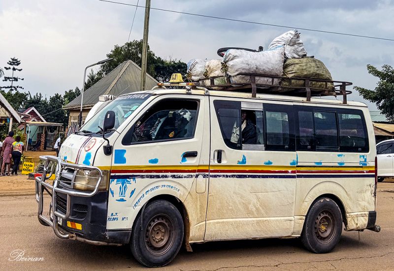 正是上班高峰时间,我们也借此机会一睹乌干达城市上班的车流。公路上看到最多的是白色有蓝格子的面包车,这是拼车小巴,是出租车的一种。没有固定时刻表,坐满才发车,乘客可以随时上下。
