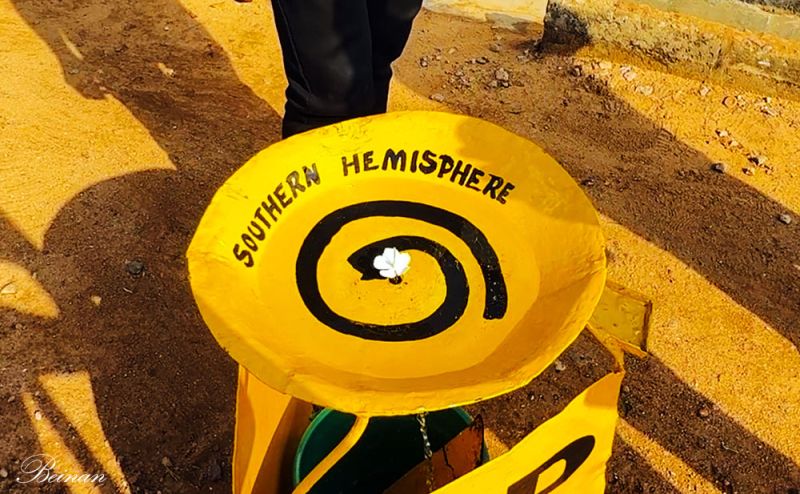 在赤道线以南,也就是南半球(Southern Hemisphere),水流逆时针旋转。