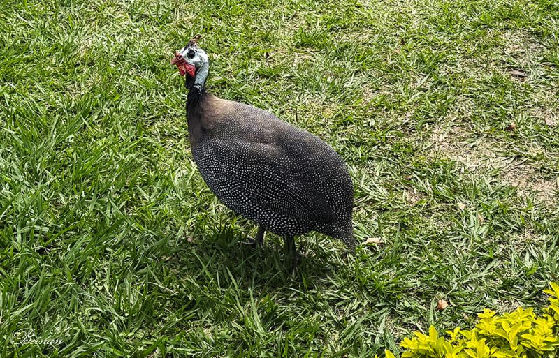 珍珠鸡在草坪上自由自在地玩耍。