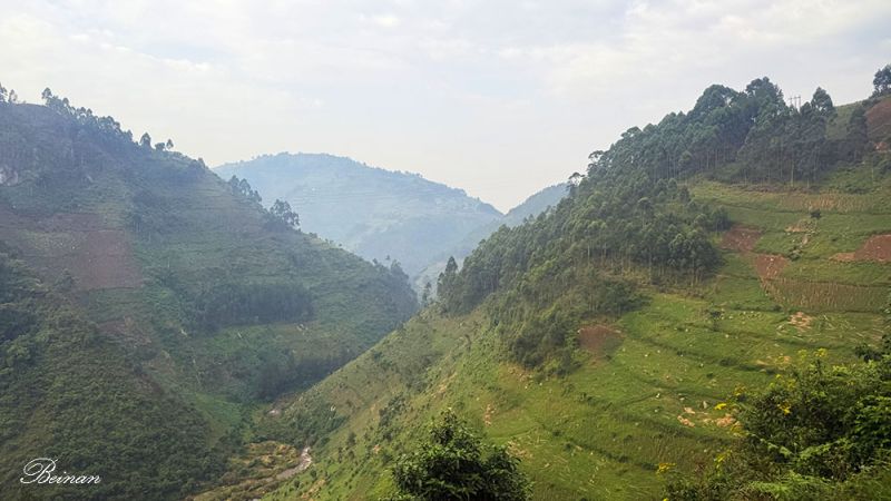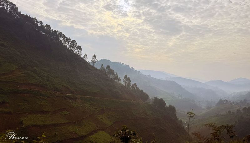 道路在山脊与谷地之间反复起伏。远处群山层层叠叠,轮廓被薄雾拉开。再次感叹乌干达得天独厚的自然条件。