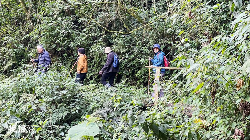 车子停到了没有道路的地方,我们必须下来走路啦。山路并不是太陡,可是这小小的土坡,已经让老太气喘吁吁了。多亏导游给了每人一根木棍,才使行进略微容易些。