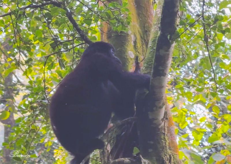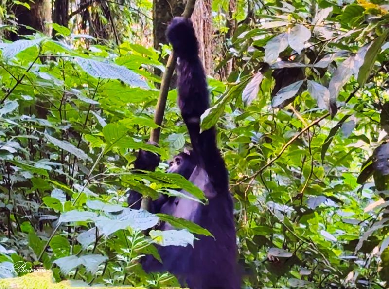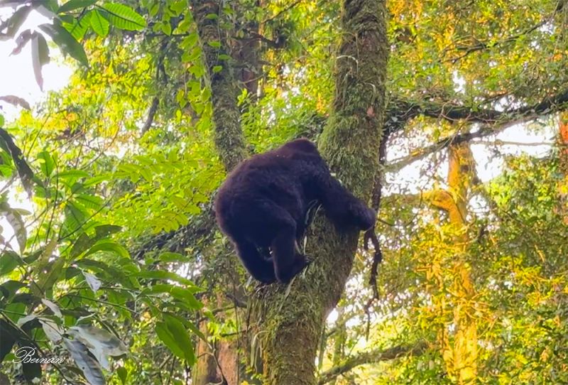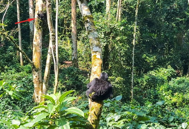 大猩猩们不断移动,找寻好吃的,我们也在密林中艰难地追寻。导游不断地提醒我们大猩猩的踪迹。又看到爬树的两只小猩猩。