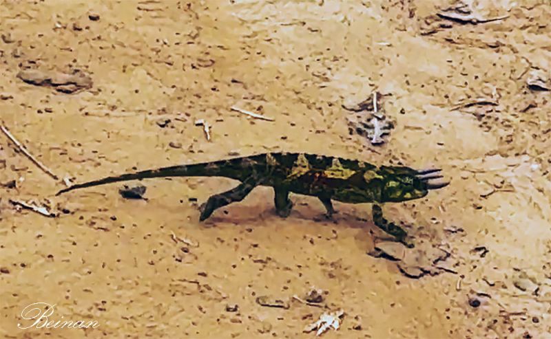 原来是前面一辆车停在了路中间,挡住了去路。前面的司机招呼我们过去看,只见一只变色龙(Chameleon)正在路中间慢腾腾地往路边走。