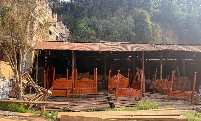 除了拥挤的市场外,国道两边看到最多的就是家具店了。粗犷的实木床架、餐桌和柜子就这样直接摆在尘土飞扬的路旁,木板木屑散落一地,木匠当场敲敲打打。