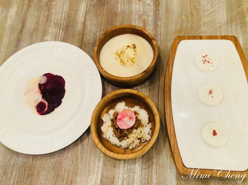 白蘿蔔與甜菜根,一清淡、一濃烈,被切成極薄的片狀,