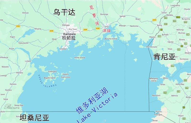 您可从下面的草图上看到津加(红字)的位置。它位于维多利亚湖(Lake Victoria)的出水口。那条细细的蓝线就是白尼罗河。准确地说,尼罗河的源头是位于津加的维多利亚湖出水口,这里是白尼罗河正式开始的地方。