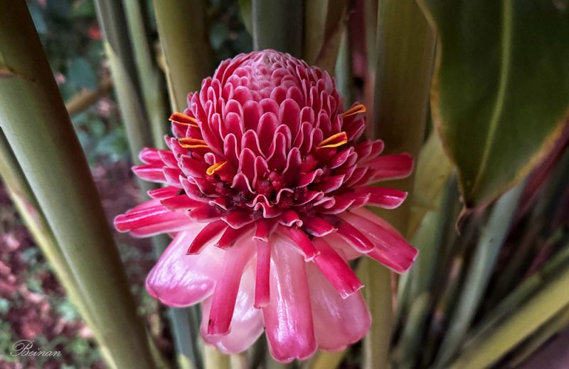 在院子里看到这种漂亮的大花,乍一看以为是假的。用手摸了摸,又看到从地里长出的花茎,才相信这是真花。后来查到,这是火炬姜花(Torch ginger),或火炬姜。粗壮的花茎从草地里直接冒出来,看起来像一支点燃的火炬。