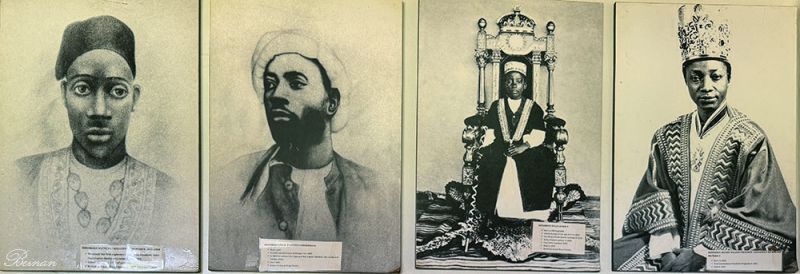 博物馆的墙上挂着很多图片,展示了布干达王室成员的肖像。下面这张照片里有4位国王,最值得注意的是右边第二位,坐在王座上的。他是布干达王国第34任国王卡巴卡·达乌迪·奇瓦二世(Kabaka Daudi Chwa II)。他出生于1896年8月8日,一岁时就登基,统治时期从1897年到1939年去世。当了一辈子国王,有36个孩子。