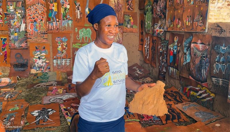 导游告诉我们,这里展示的都是她和她的同事们创作的树皮画。她的家乡有很多纳塔尔无花果树。村子里的父辈们负责制作树皮布,她们在旅游地区边画边卖。