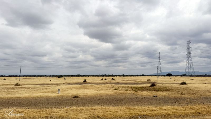 公路两侧是干季的荒草地,高压电塔笔直地站在草原上;更远处,却是一线浓绿的森林。野性与现代,并肩存在。