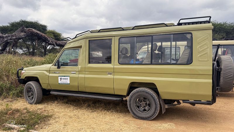 只能从车后的备用胎的罩子上分辨。我们的车有9个座位,我们4个人加一个司机,还是很舒服的。特别是顶棚升起后,我们可以站在座椅上任意换位置观景。如果坐满了9个人,就要遭点罪了。我们也看到了挤得满满的车子,行李都堆在了车顶。