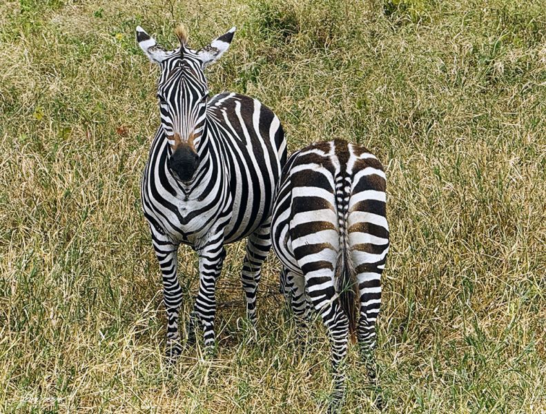 登上游猎车,进入公园不远就看到了一群斑马((Plains Zebra)。我们的车离它们很近,可以清晰地看到它们身上经典的黑白条纹。条纹独特,每只斑马都有不同的纹路。