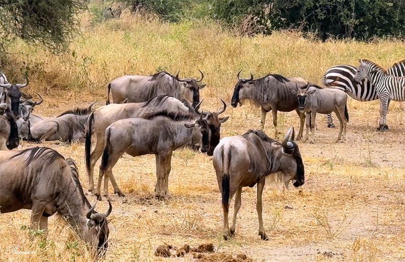 角马(Wildebeest)成群站在草地上,灰褐色的身体几乎与土地融为一体。它们在塔兰吉雷很常见,喜欢和斑马在一起。这个群里,可以看到几个幼崽。