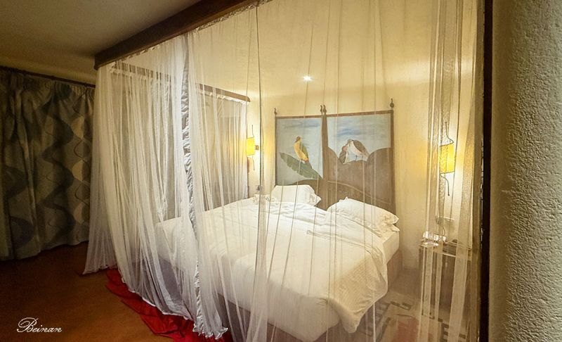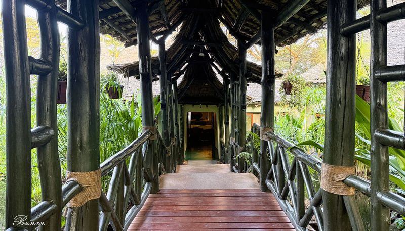 接待大厅通往餐厅的过道都是木质与非洲风格装饰,古朴而温暖。地板踩上去略带吱呀声,仿佛在提醒你每一步都接近大自然。
