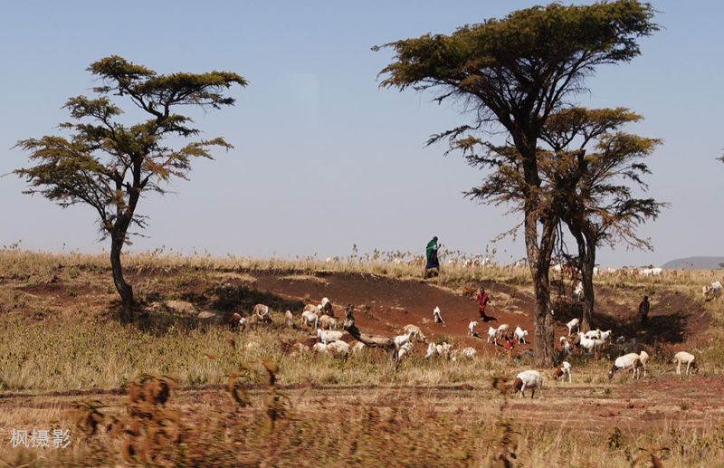 车子行驶在平坦的柏油路上。路边时常看见马赛(Maasai)牧人和牛群。