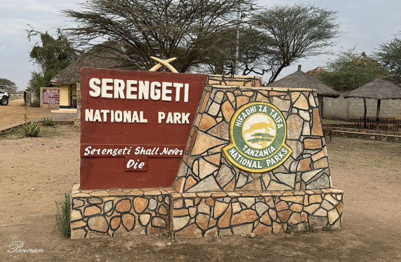 车子驶入塞伦盖蒂国家公园。这是坦桑尼亚的首座国家公园,建于1951年。牌子上有一句广为流传的话,“Serengeti Shall Never Die”(塞伦盖蒂永不消亡)。