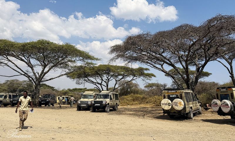 国家公园的停车场上停着很多游猎车,长得几乎一样。伞状金合欢树(Acacia tree)在蓝天白云的陪衬下魅力无限。