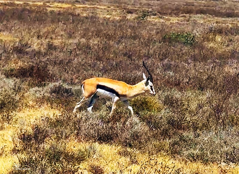 汤姆森瞪羚(Thomson's gazelle) 是东非草原上最常见、也最典型的一种瞪羚。它们体型较小,身体侧面有一道明显的黑色横带,尾巴常不停地摆动。