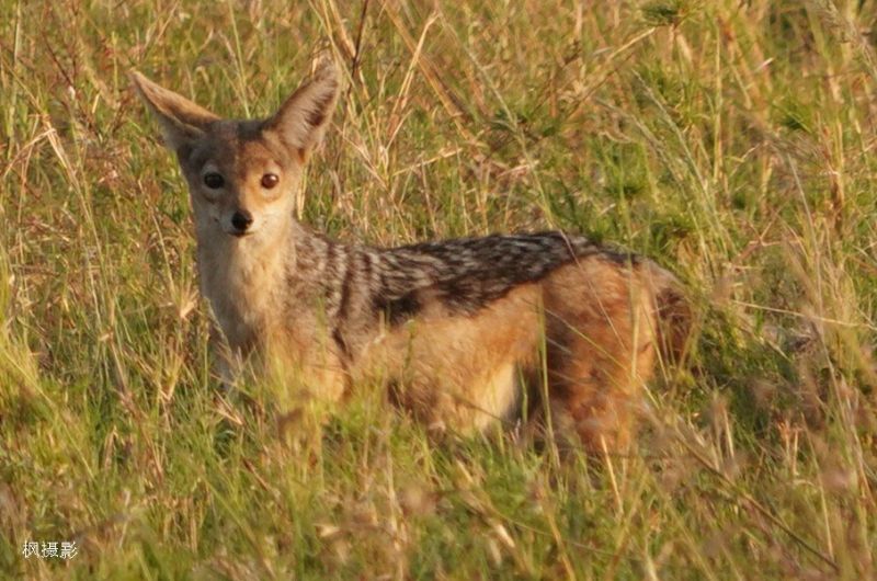 黑背胡狼(Black-backed jackal)是非洲最常见、也最“精明”的犬科动物之一。它常跟在狮子、鬣狗后面“捡漏”。它的背部有一块银黑色“披风”状毛色,从肩一直延伸到尾巴——这就是黑背的来源。看它那样子,像一个永远保持警觉的小侦察兵。