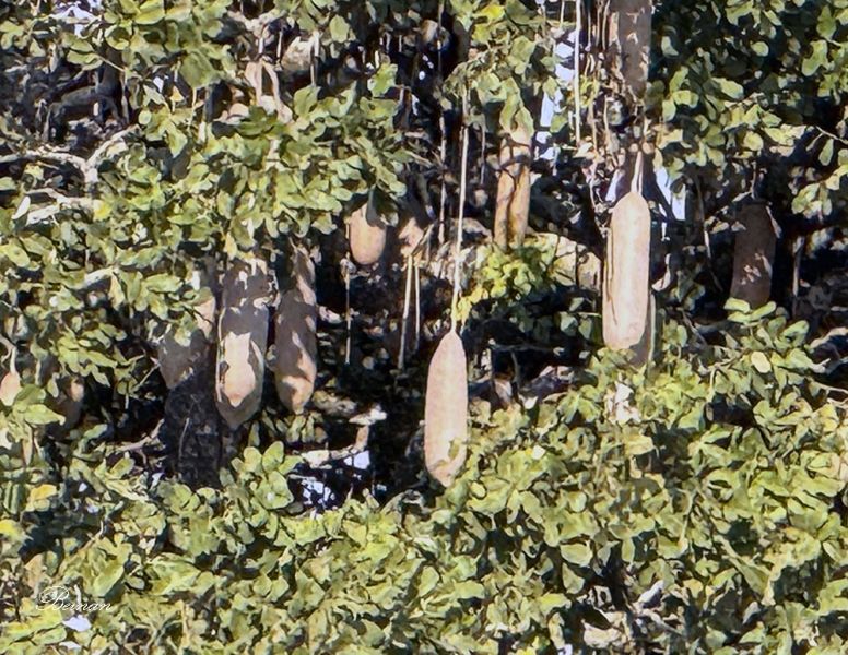 导游指着一棵树告诉我们,那是香肠树(Sausage Tree)。我们仔细看,上面挂着的果实果然像香肠。