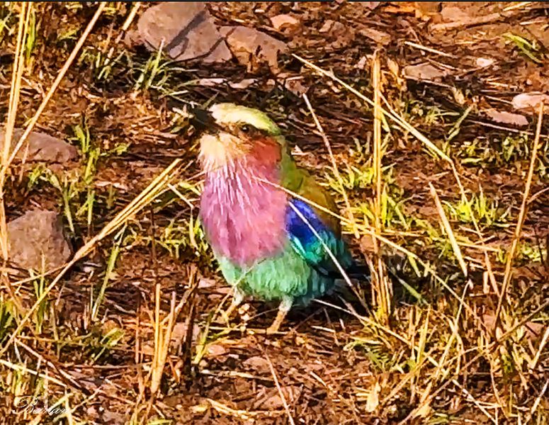 在塞伦盖蒂草原上,看到很多漂亮的鸟。这是紫胸佛法僧(Lilac-breasted Roller),或紫胸佛法鸟。它的胸部是美丽的紫色。