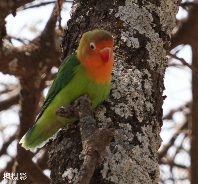 丽莲凤头鹦鹉(Lilian’s Lovebird), 也叫爱情鸟,是非洲特有的一种小型鹦鹉。它站在树枝上,鲜艳的红、绿、橙色在阳光下闪烁,非常醒目,给金色草原添上生动的小色块。