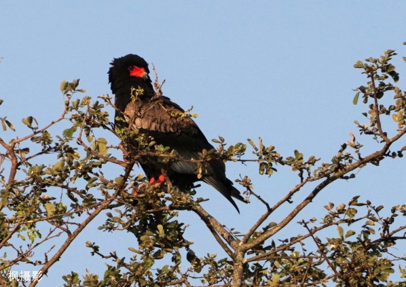 短尾雕(Bateleur)尾巴非常短,飞行时像杂技动作一样翘起。它的名字 Bateleur就是“马戏表演者”的意思。它以腐肉为主,也吃小型哺乳动物和爬行动物。它的红嘴和红爪特别引人注目。