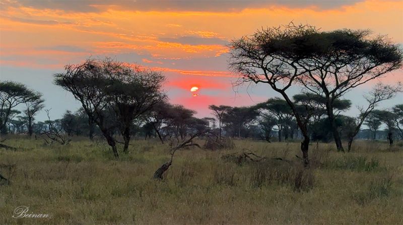 清晨的塞伦盖蒂分外迷人。初升的太阳将天空染成橘红色,草原像被一层温柔的火焰点亮。金合欢树(Acacia tree)静静伫立在草丛中,枝干平展,在晨光里勾勒出清晰的剪影。