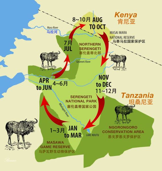 每年约有150万头角马、20-50万头斑马和30多万头瞪羚(Gazelle)在塞伦盖蒂和马赛马拉之间循环迁徙,寻找水源与新鲜草场。