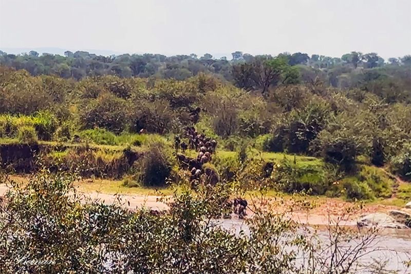 手机镜头都来不及对焦,前面有树挡着,也还不及挪地方,角马过河几乎是转瞬即逝。