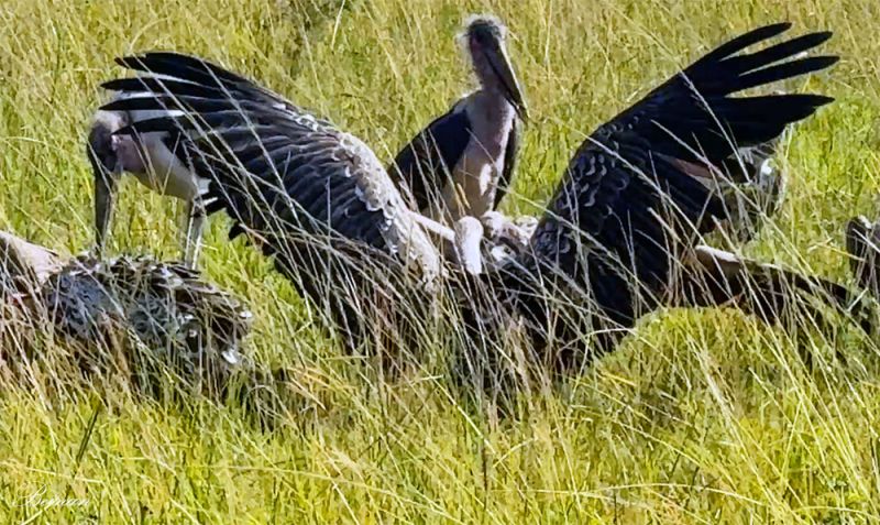 远处,一大群非洲秃鹫(African Vultures)和马拉布鹳(Marabou Stork,也称秃鹳)在抢食不知是什么动物的尸体。它们是草原清道夫,共同维护草原的生态循环。