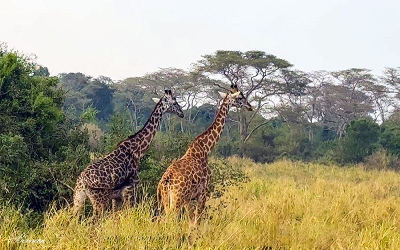 两只长颈鹿从树丛中缓缓走出,它们的颜色立刻引起了我们的注意。看过太多长颈鹿了,但还是第一次看到这样深浅不同的长颈鹿。导游告诉我们,这两只都是马赛长颈鹿(Masai giraffe)。深色的是一只年长的雄性,浅色的很可能是雌性,或是年轻的个体。