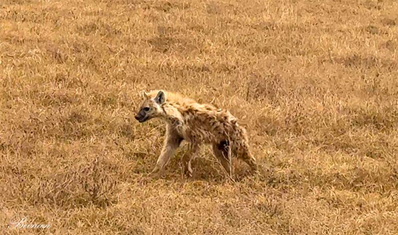 忽然看到一只鬣狗(Hyena)在草原上跑过。远远的,后边还有一只前腿瘸了,浑身狼狈不堪的鬣狗执拗地跟在同伴后面。虽然在《狮子王》(Lion King)中,对鬣狗的印象很不好,但是看到这一幕,还是觉得它很可怜。