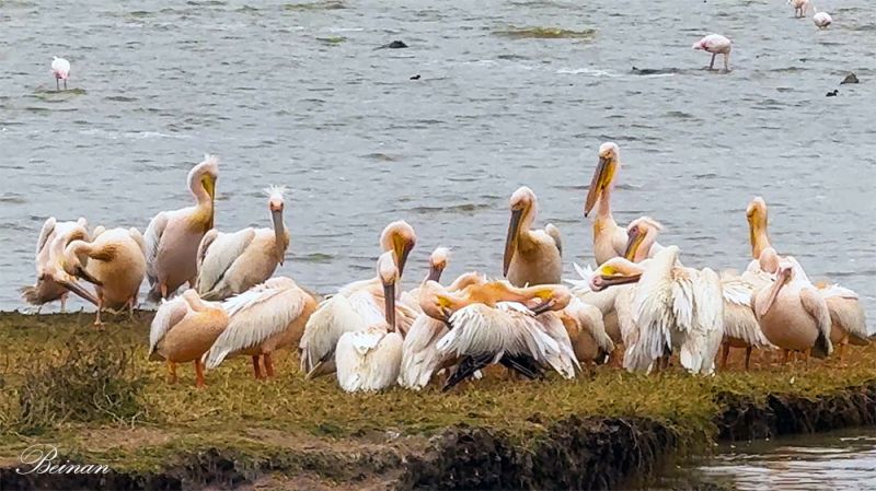 一群大白鹈鹕(Great White Pelicans)聚集在湖边的草地上,特别惹眼。我还从没有看到过这么多这么大的鸟聚集在一起。