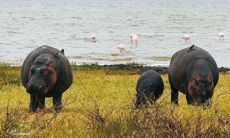 一大群河马(Hippopotamus,简写Hippo)在岸上静静地吃草。这可是罕见的一幕。因为大多数情况下,河马白天都在水下睡觉,真正的觅食和活动高峰是在夜里。这三只里有老有小,不知是不是一家子。