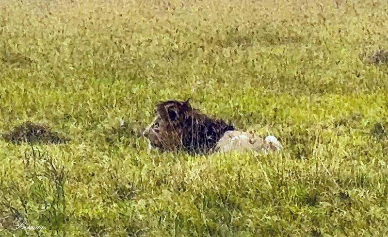 一只公狮子静静地趴在草丛中,不知是在等候猎物还是在偷懒。头上的鬃毛不注意看,就像是草地上的一堆干草。