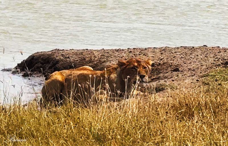 湖边,有一只母狮在静静地守候。一看那刻意将自己隐藏起来的架势,就是要伏击猎物。