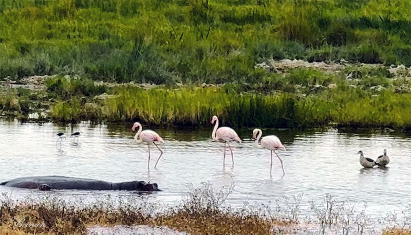 火烈鸟、黑翅长脚鹬(Black-necked Stilts)、棉小鸭(Cotton Pygmy-Goose),还有大河马,同一个画面,和谐相处,多么温馨的景象!