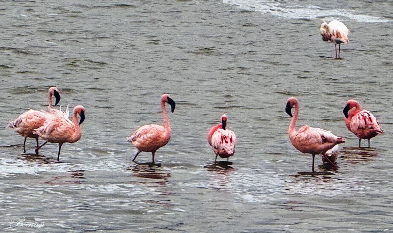 这里的火烈鸟有不同颜色。粉红色的火烈鸟体型较小些,它们的嘴是深红色,尖端是黑的。